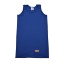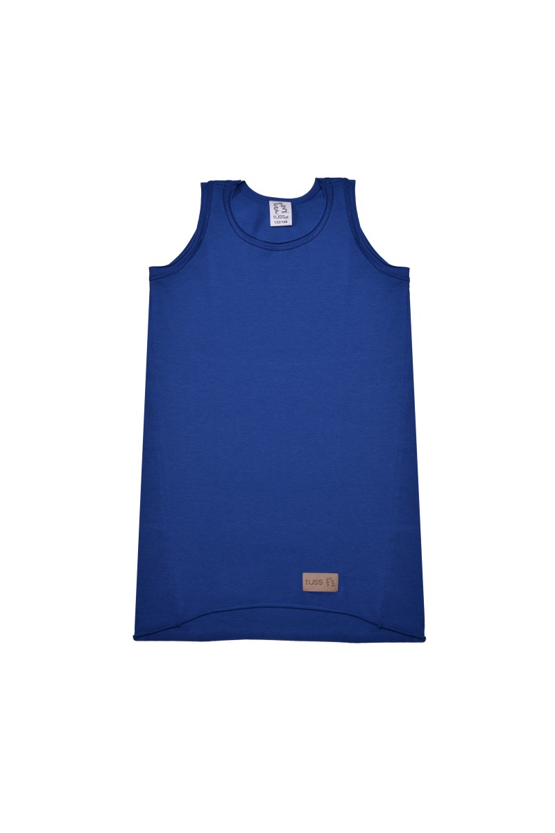 Dziecięca sukienka na szerokich ramiaczkach wykonana z cienkiej dzianiny o sportowym kroju. Na dole surowe wykończenie