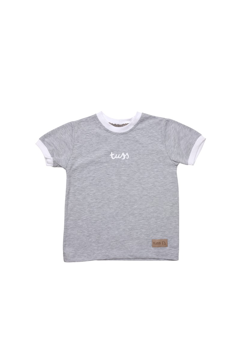 Wiosenny t-shirt z nadrukiem TUSS w kolorze szarym wykonczony pod szyją i na rękawkach ściagaczem bawełnianym.